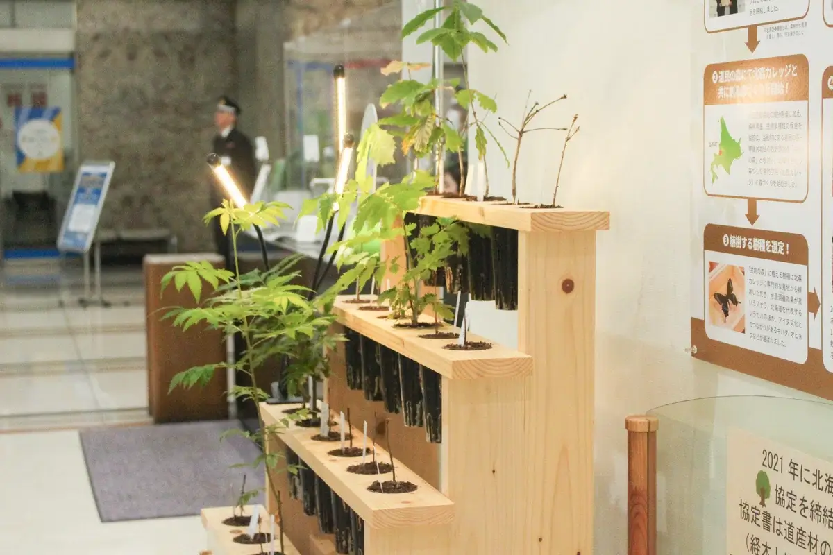 ソマノベースは、北海道庁や企業と連携し、オフィス内で苗木を育て、その後に北海道の森林へ戻す取り組み「MODRINAE HOKKAIDO」を推進しています。