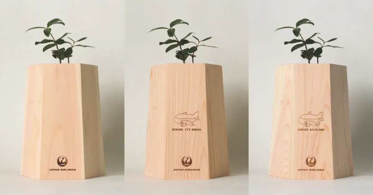 今回、JALのロゴマーク「鶴丸」をはじめとして、エアバス A350-900型機、ボーイング 777-300ER型機の木鉢をご用意いただきました。レーザー加工を利用して、ロゴやイラストの細部まで再現されています。