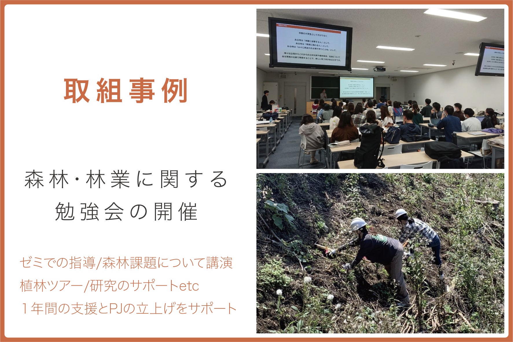 ご提案内容:1年間の森林教育プラン(週1回ゼミでの指導・林業家講演2回(森林課題について)、植林ツアーの企画と実施等)、研究のサポートゼミ内での森林保全プロジェクトの立上げ支援