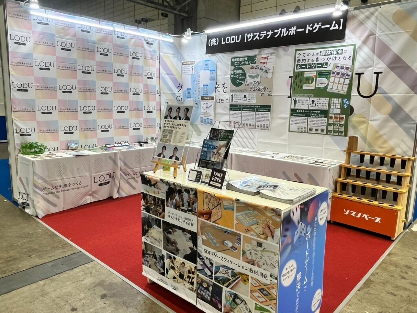 ロデュ様はこれまで、企業・自治体・教育機関向けに、SDGs/サステナビリティをテーマとしたボードゲームの開発や研修を展開されてきました。今回の展示では、現在開発中の「カーボンバジェットゲーム」や「森林保全ゲーム」を中心に展示されており、その中で、当社と共同開発した「森林保全ゲーム」に関連して、「MODRINAE」もご紹介いただいています。