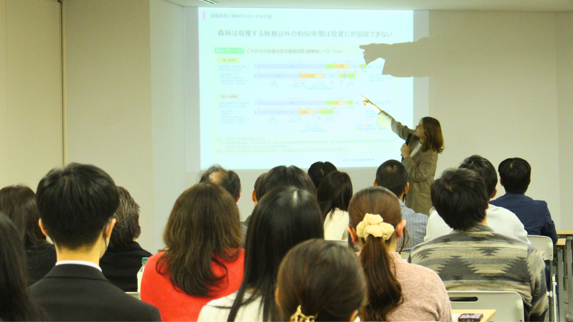 講演では、ソマノベースの事業紹介をはじめ、森林や林業が抱える課題、そして「戻り苗」に取り組む意義についてお話ししました。