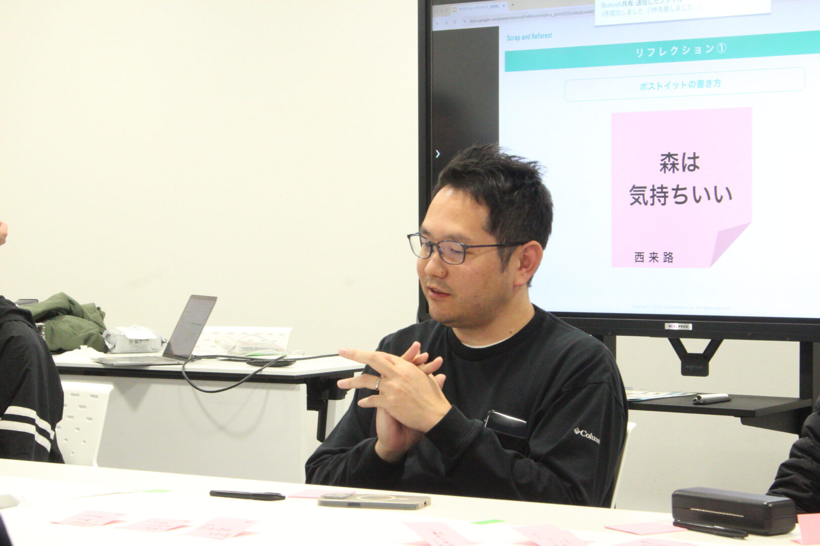 森林体験や視察で得た気づきを共有しながら、森が持つ可能性を多角的に議論。千品様との意見交換も交えて、企業としてどのように森と関わり続けるのかをそれぞれが言語化する時間となりました。